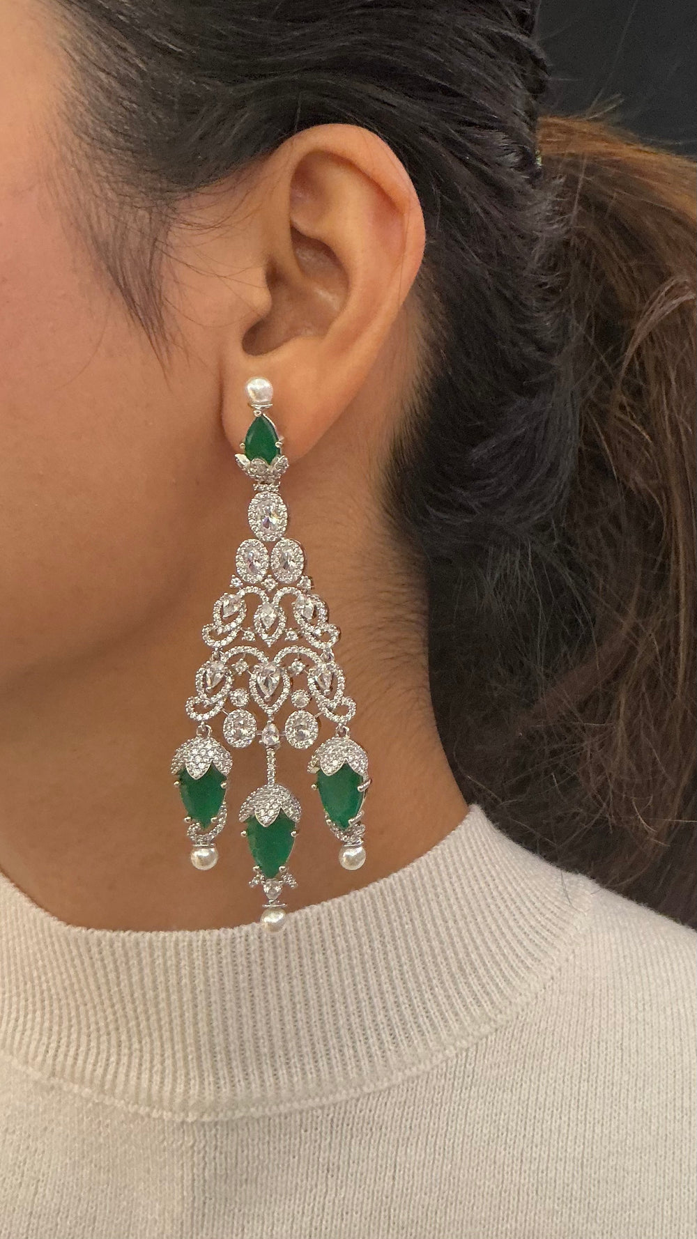 Emerald Green & Pearl Kundan Bridal Necklace Set with Heavy Statement Earrings