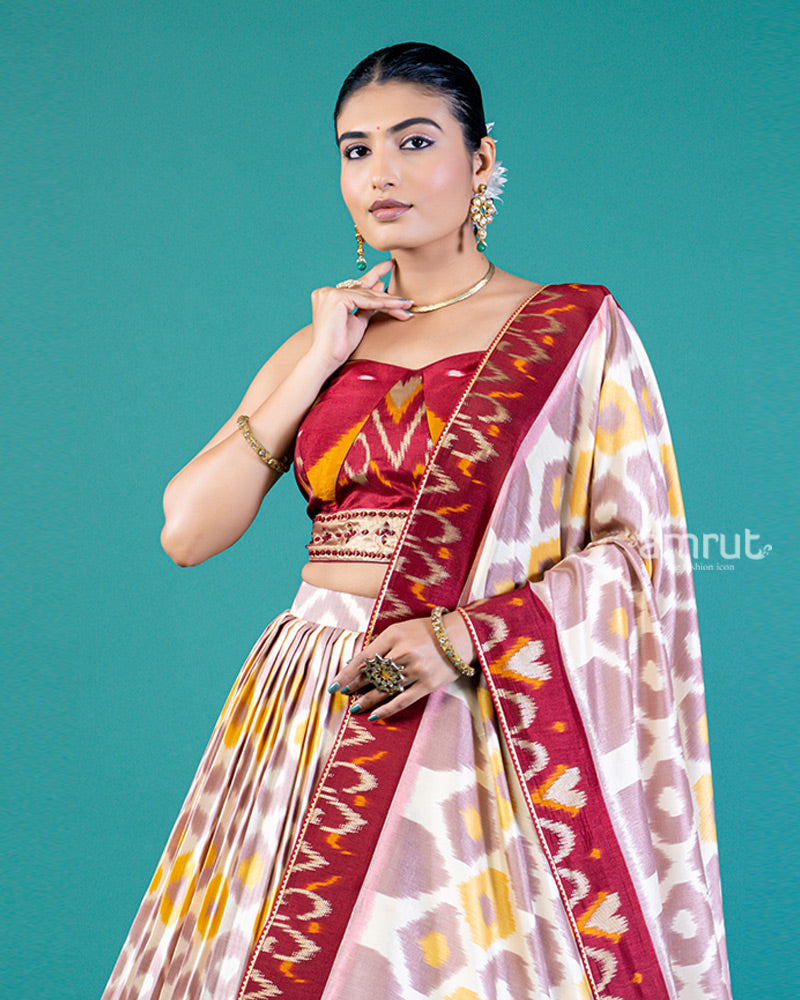 This elegant lehenga set features a cream-beige and light-purple pleated lehenga with geometric patterns in yellow, cream, and muted purple, finished with a maroon-red floral trim. The maroon-red sleeveless blouse mirrors the skirt’s trim with a stylized design. A matching maroon-red dupatta completes the look, creating a harmonious and sophisticated ensemble perfect for special occasions.