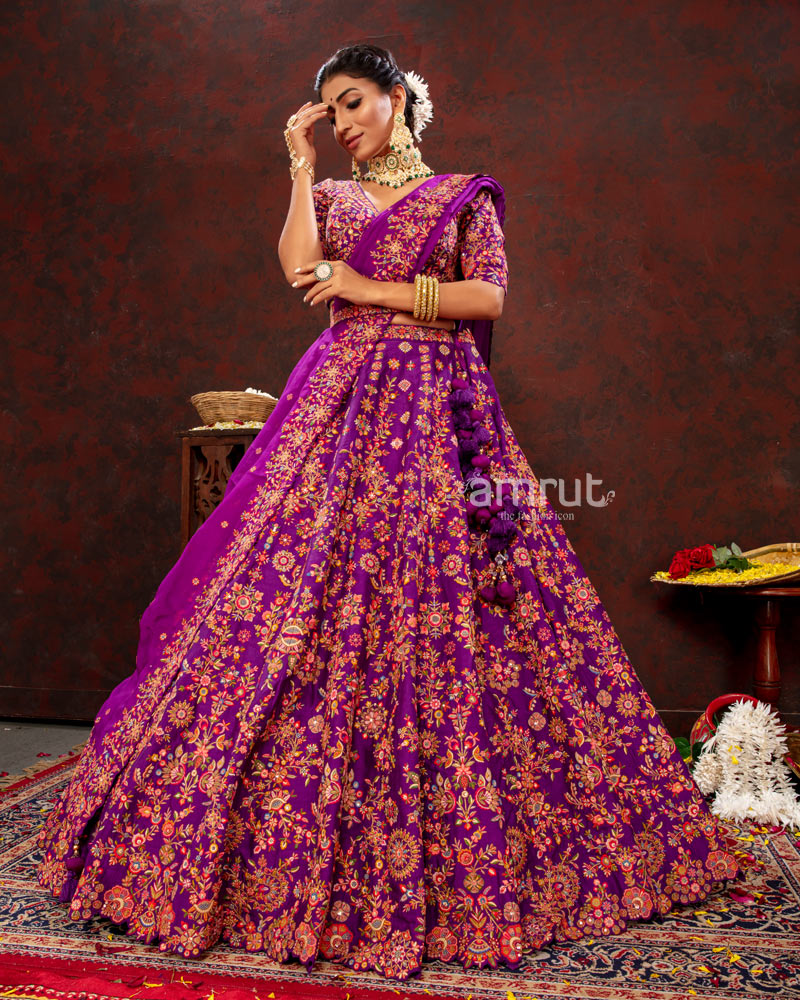· Dark Orchid Floral Embroidered Bridal Lehenga Choli With Dupatta.