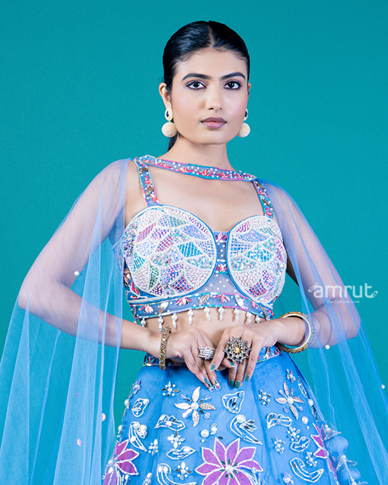 This light sky-blue lehenga choli features intricate floral embroidery in pink, purple, and beige tones, with sparkling sequins and embellishments. The fitted sleeveless choli is adorned with multicolored stones and beaded accents. A sheer light-blue dupatta with a frilly trim completes the elegant look.