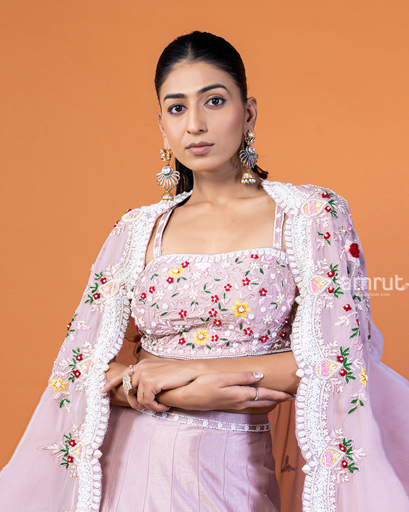 Light Purple Embroidered Lehenga Choli and Shrug Style Floral Lace Dupatta