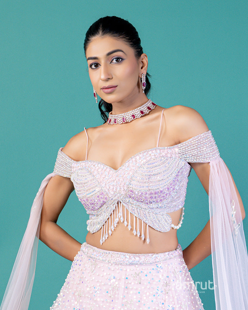 Off Shoulder Butterfly Embellished Choli with Blush Pink Lehenga and Beaded Waistband