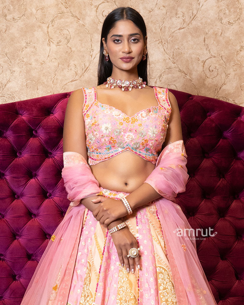 This vibrant pink lehenga features intricate floral embroidery paired with temple and kalash motifs on the skirt, exuding festive charm. The blouse showcases delicate threadwork with mirror highlights, adding a hint of sparkle. Finished with a soft net dupatta adorned with scattered embellishments and tassels.
