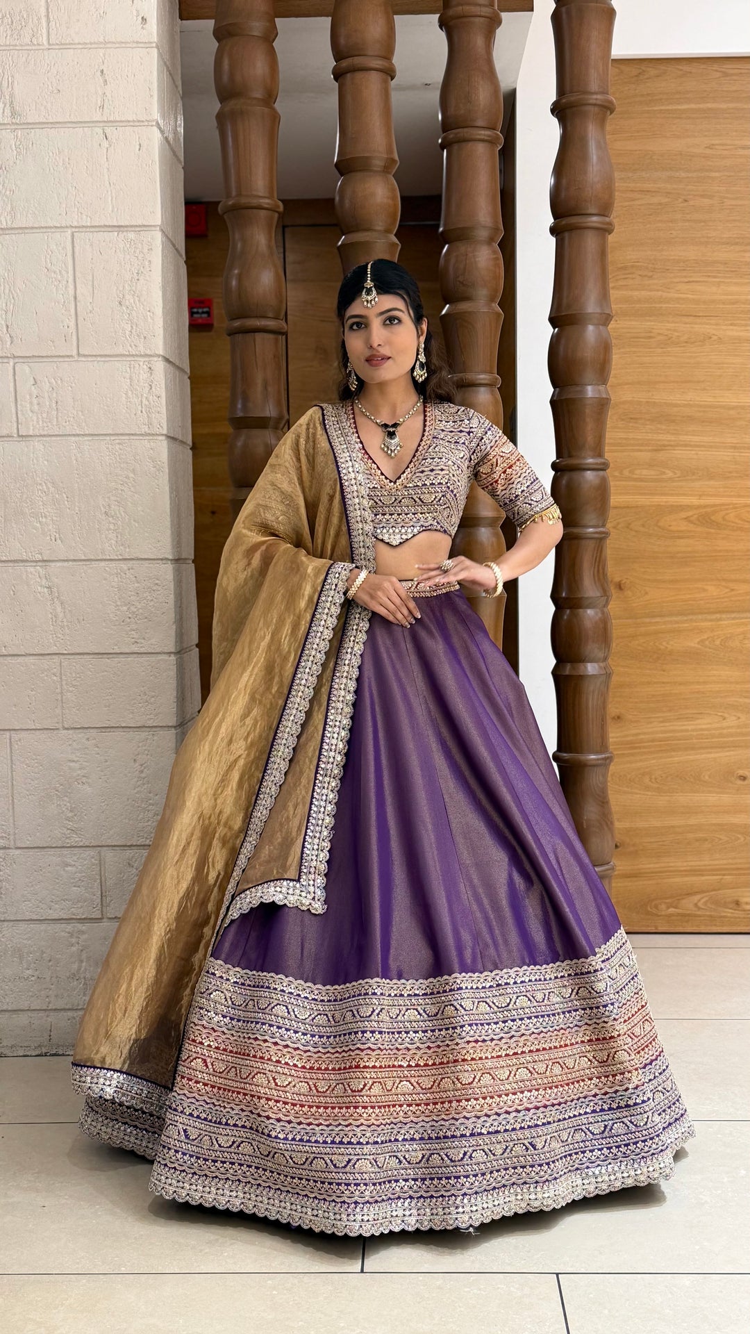Royal Purple Silk Lehenga Set with Heavily Embroidered Blouse & Gold Dupatta