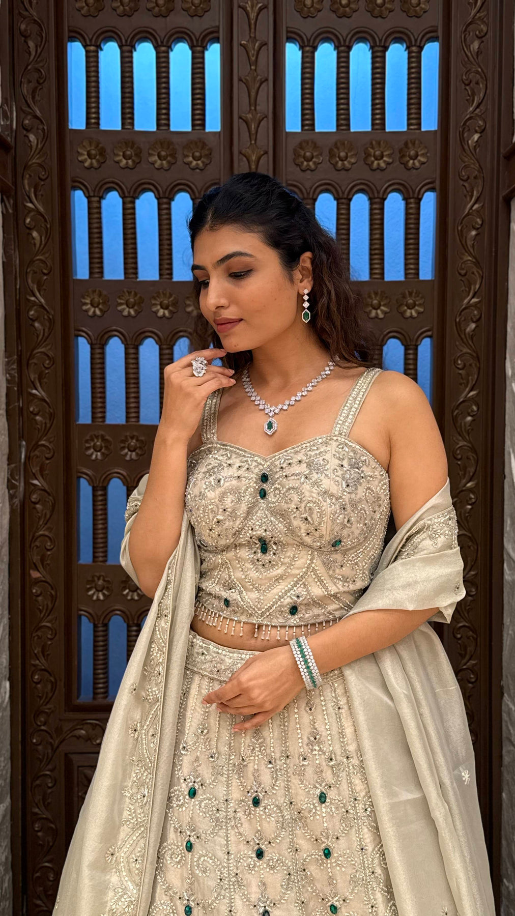 Step into timeless elegance with this Luxury Ivory Embellished Lehenga Choli, crafted to make every moment unforgettable. The richly adorned choli features intricate hand embroidery using sequins, stones, pearls, and cutdana, creating a regal, high-shine effect.