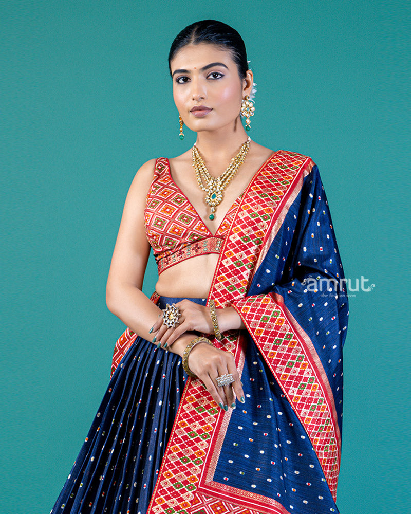 This lehenga choli set features a navy blue lehenga with a pleated, full skirt adorned with a rich border in red, pink, and orange, and intricate weaving along the hem. The sleeveless V-neck choli complements the lehenga with a patterned bodice in reddish-orange and gold. A matching dupatta drapes gracefully, echoing the colours and texture of the lehenga, completing the elegant look
