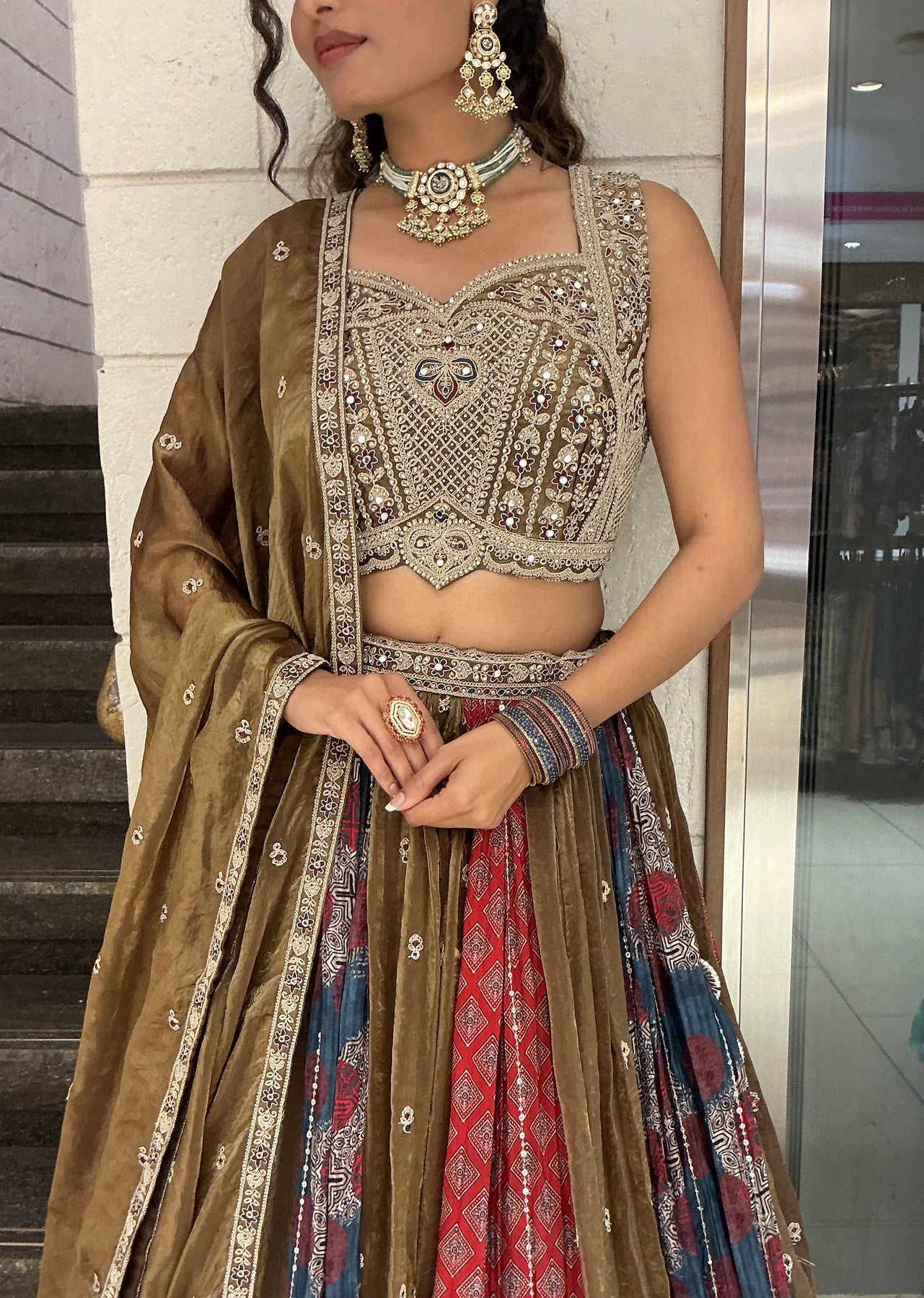 Step into regal elegance with this stunning Olive Brown Designer Lehenga Choli Set, inspired by traditional Indian heritage craftsmanship. The lehenga features a rich velvet-finish base adorned with multicolour heritage panels, intricate embroidery, mirror accents, and zari detailing, creating a luxurious and royal appeal.