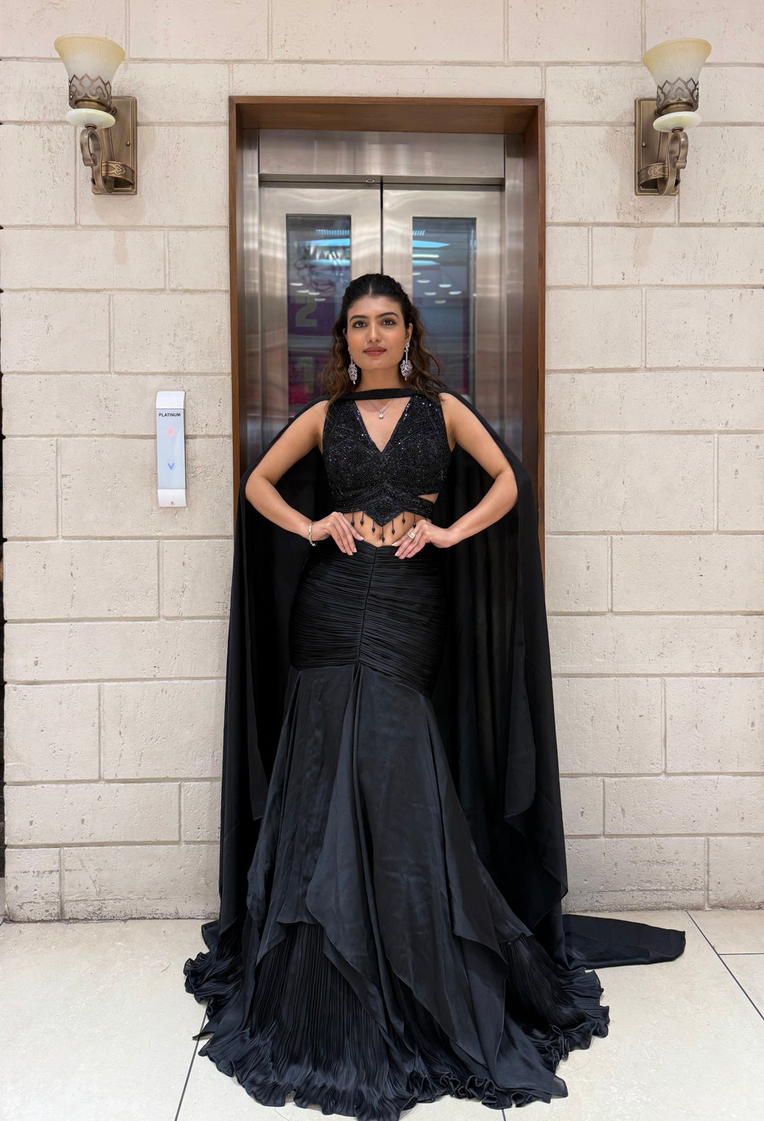 Midnight Black Indo-Western Mermaid Gown with Sequin Corset & Draped Cape Sleeves