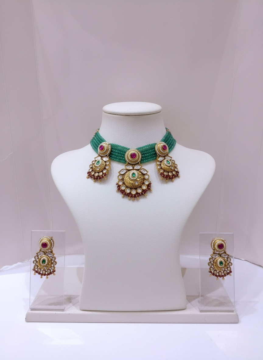 Emerald Green Beaded Kundan Choker Necklace Set with Enamel Pendant