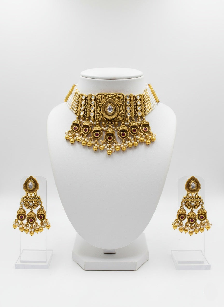 Antique Gold & Pearl Kundan Choker Set with Jhumka Earrings