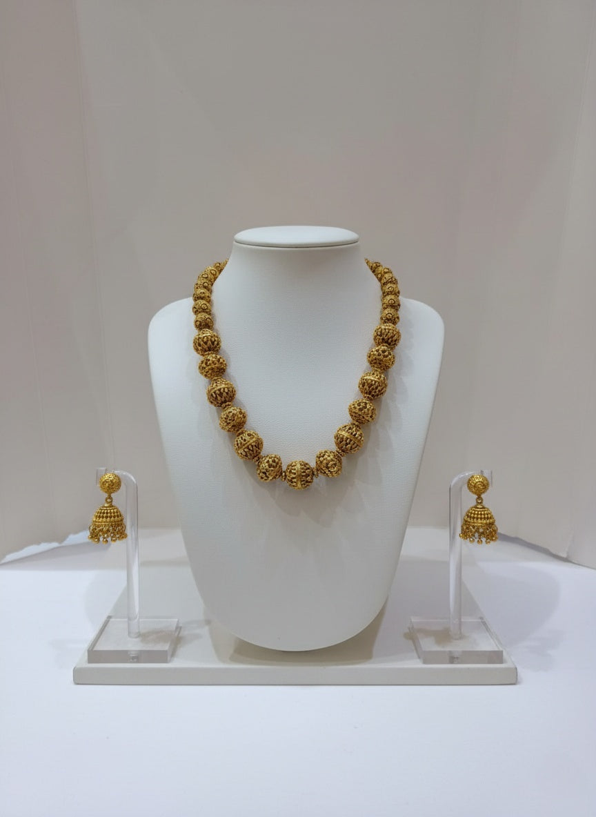 Classic Gold Bead Necklace Set with Jhumka Earrings – Traditional Filigree Design Jewelry