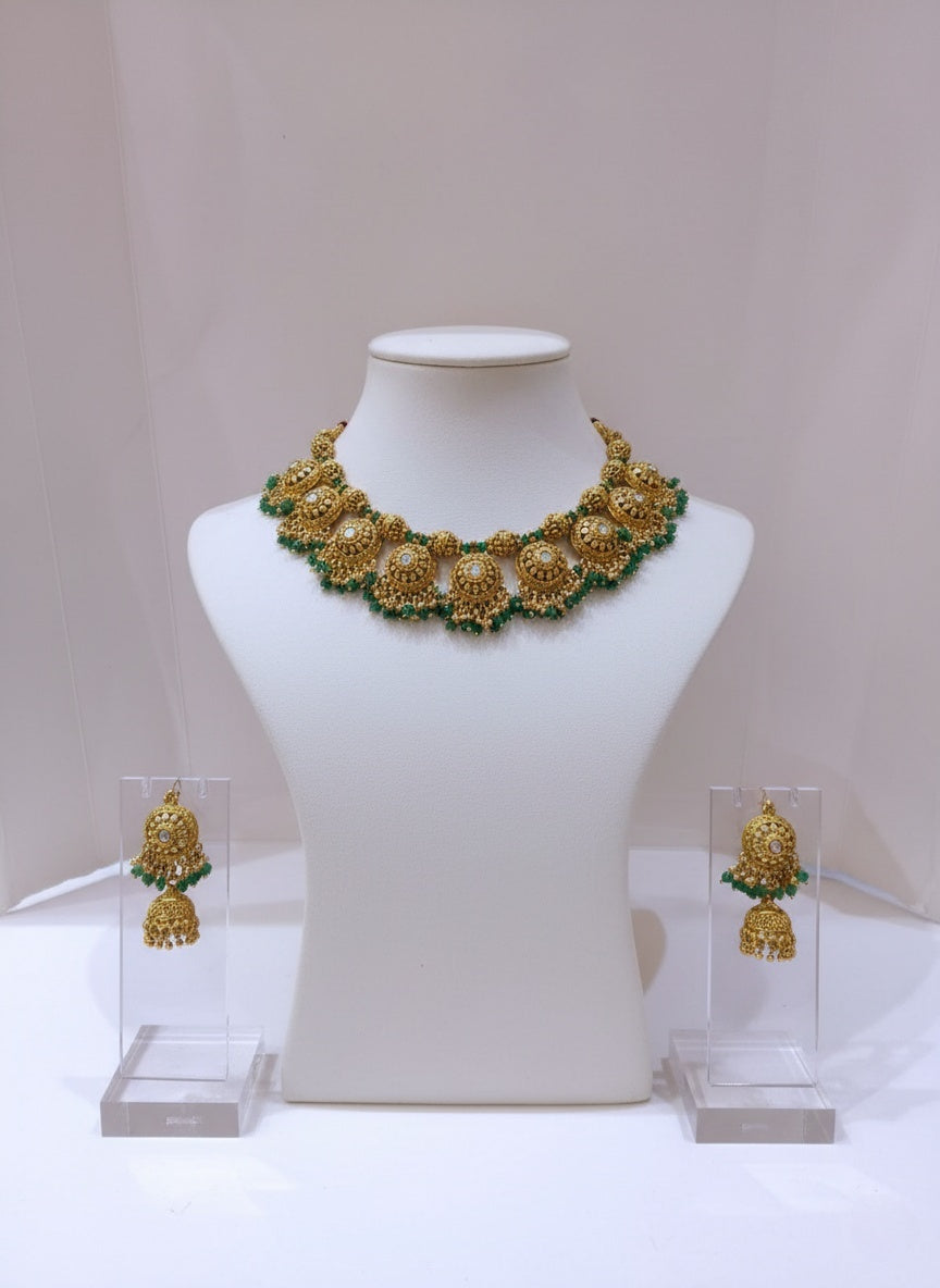 Antique Temple Necklace Set with Green Bead Detailing & Jhumka Earrings