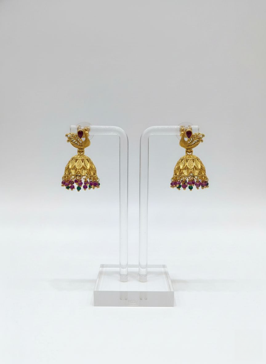 This exquisite set features a handcrafted gold-tone necklace with a beautifully sculpted peacock motif pendant, adorned with delicate ruby and emerald beads for a pop of color and richness. The finely textured chain complements the pendant’s flowing feathers, adding balance and elegance.