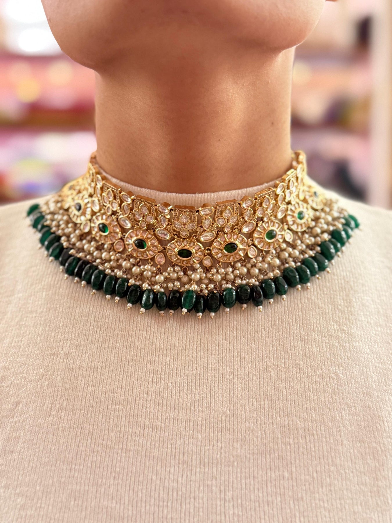 Regal Kundan & Emerald Choker Necklace Set with Layered Pearls