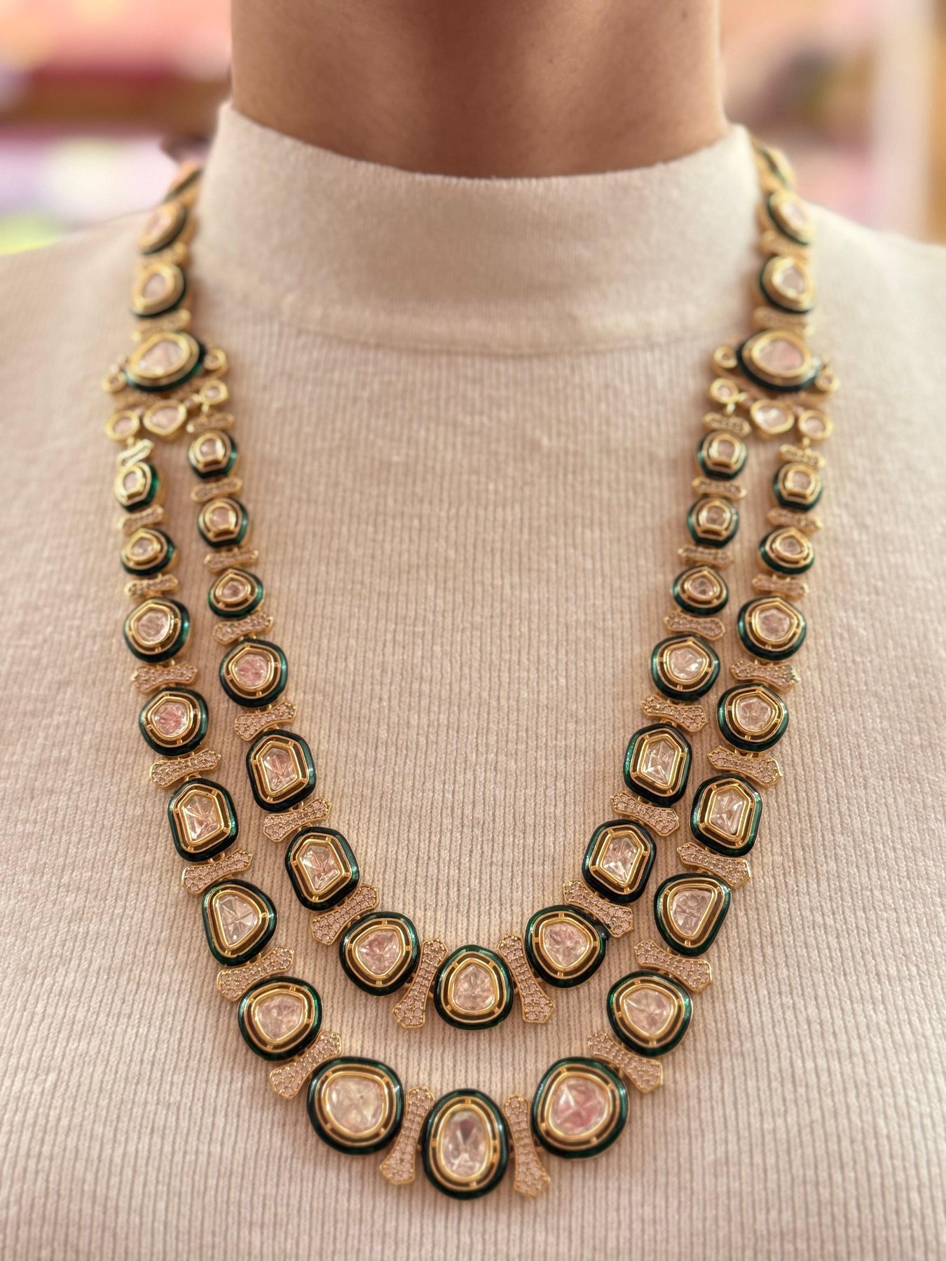 ⢠Design: Double-Layered Polki Necklace with Matching Maang Tikka