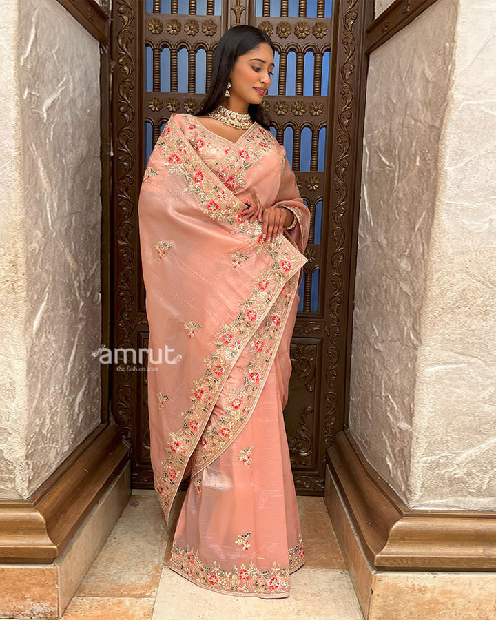 This peach saree is adorned with intricate floral embroidery in light golden, beige, and pink, enhancing its sheer, lightweight organza fabric. The blouse features a V-neckline and short sleeves, creating a refined and graceful look. Ideal for festive and formal events.