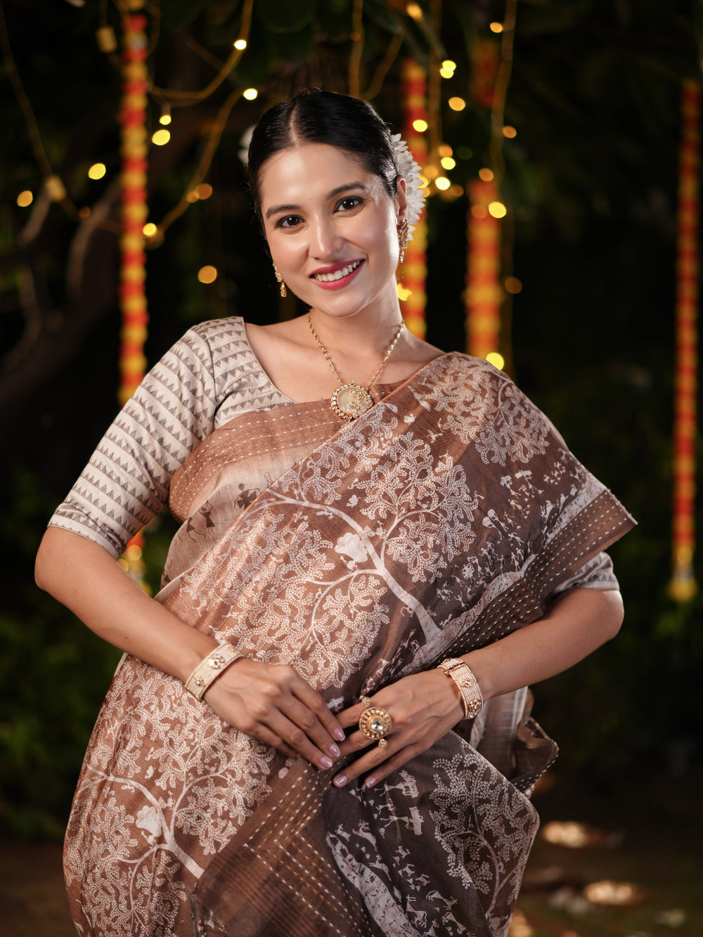 Brown PV Cotton Khadi Saree with Intricate Floral Prints and Unstitched Blouse