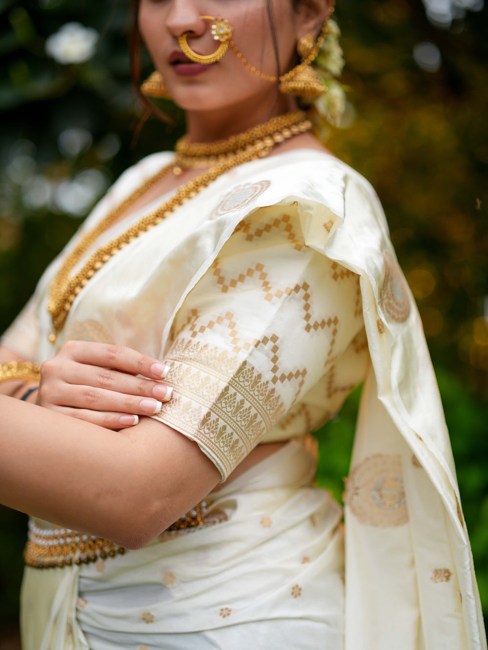 Elegant Off-White Soft Silk Saree Golden Zari with Unstitched Blouse