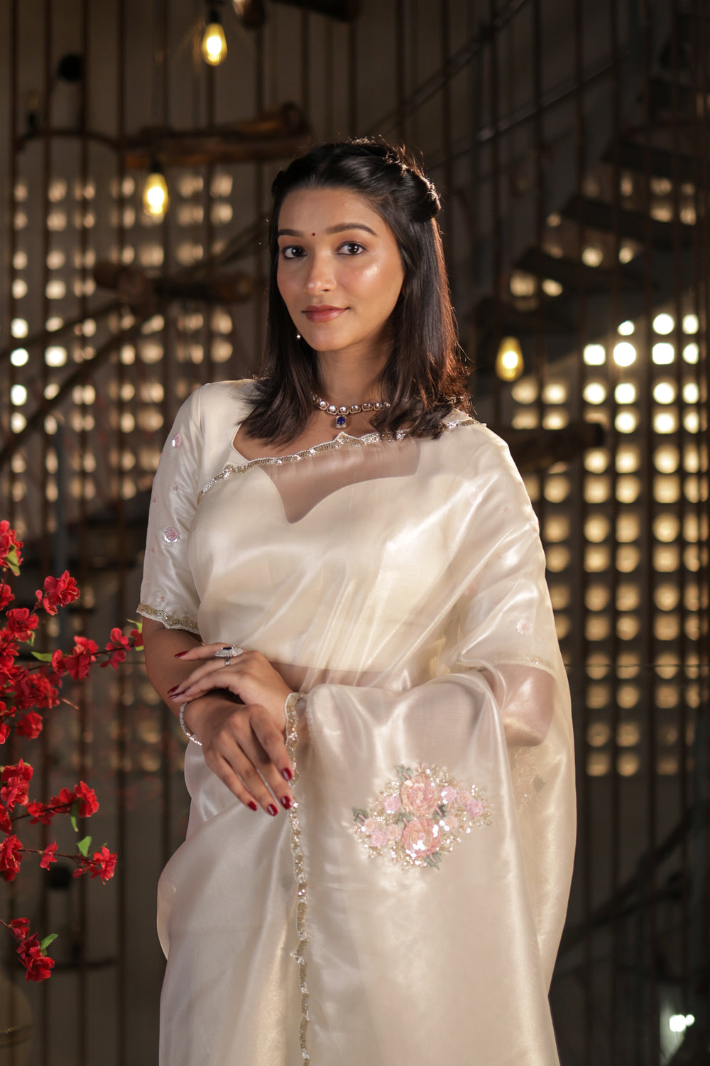 Delicate floral sequin embroidery in soft blush tones adds a touch of femininity and sparkle, making it an ideal choice for engagements, receptions, festive events, or elegant daytime functions. The subtle scalloped border with beadwork gives it a refined finish, while the lightweight texture keeps it comfortable all day.