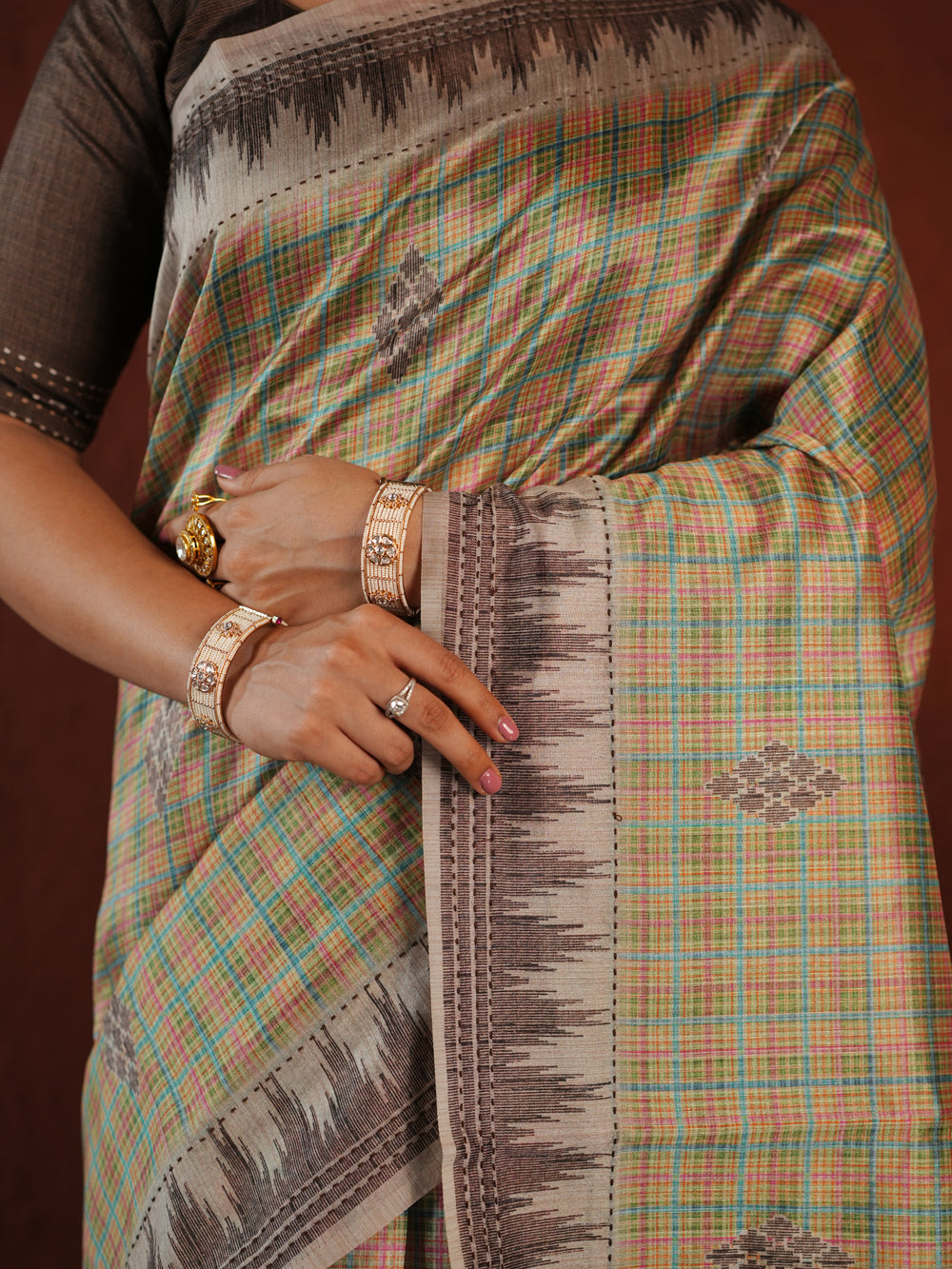 The muted earthy tones and traditional weaving techniques lend the saree a timeless charm, while the contemporary design elements add a touch of sophistication. It comes with a matching unstitched blouse piece, giving you the freedom to personalize it to suit your unique style.