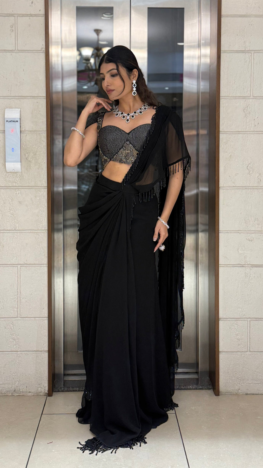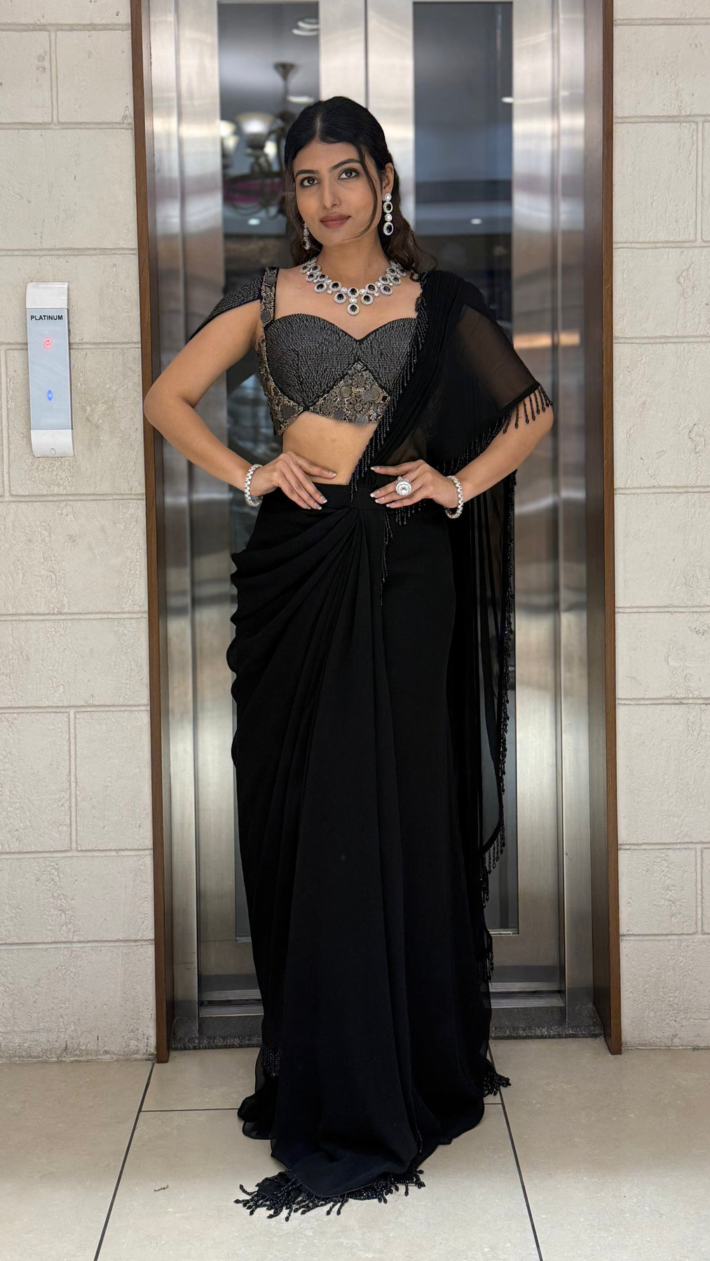 Midnight Black Pre-Draped Saree with Metallic Embellished Bustier Blouse