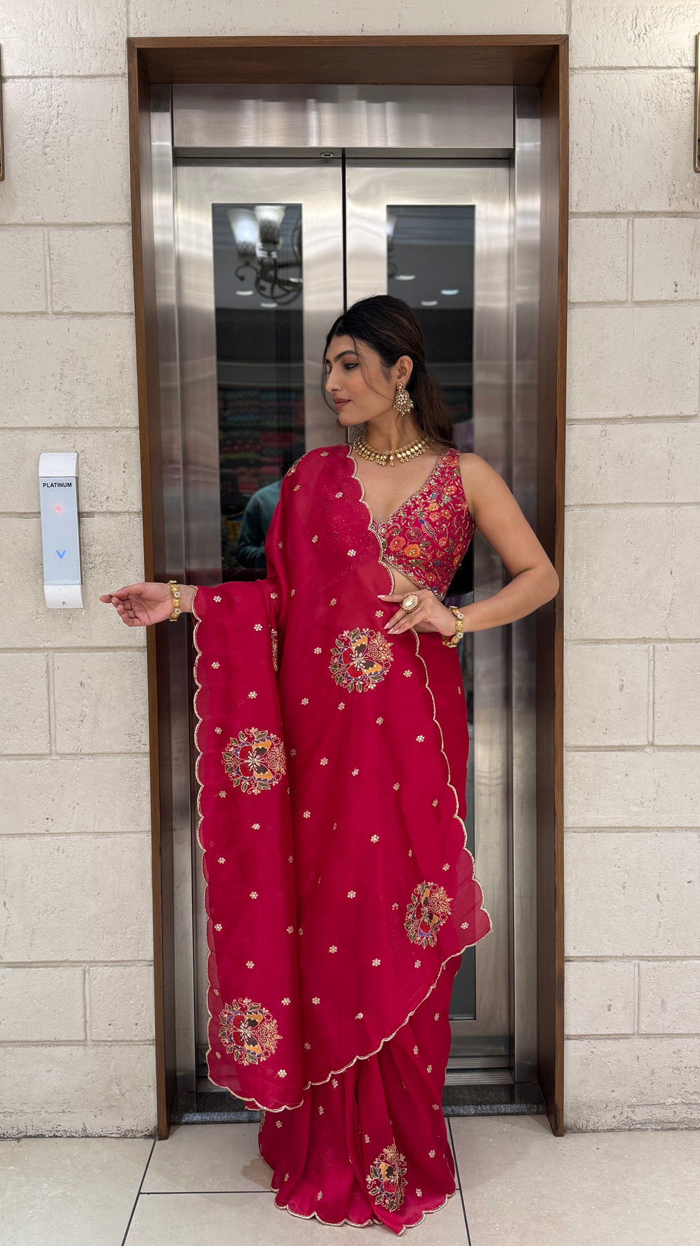 Pallu Style: Embroidered pallu with floral motif highlights