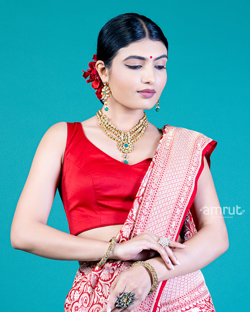 Red Floral Zari Embellishments Saree and Unstitched Blouse