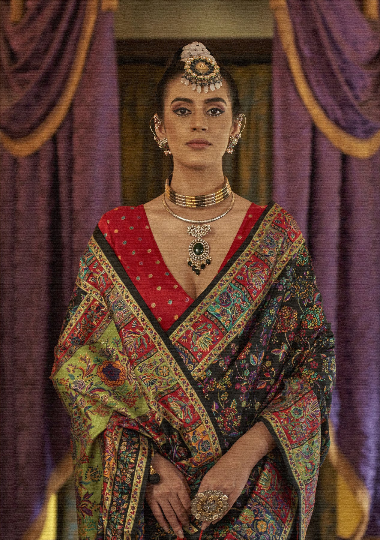 Royal Black Pashmina Inspired Heritage Print Saree with Red Blouse