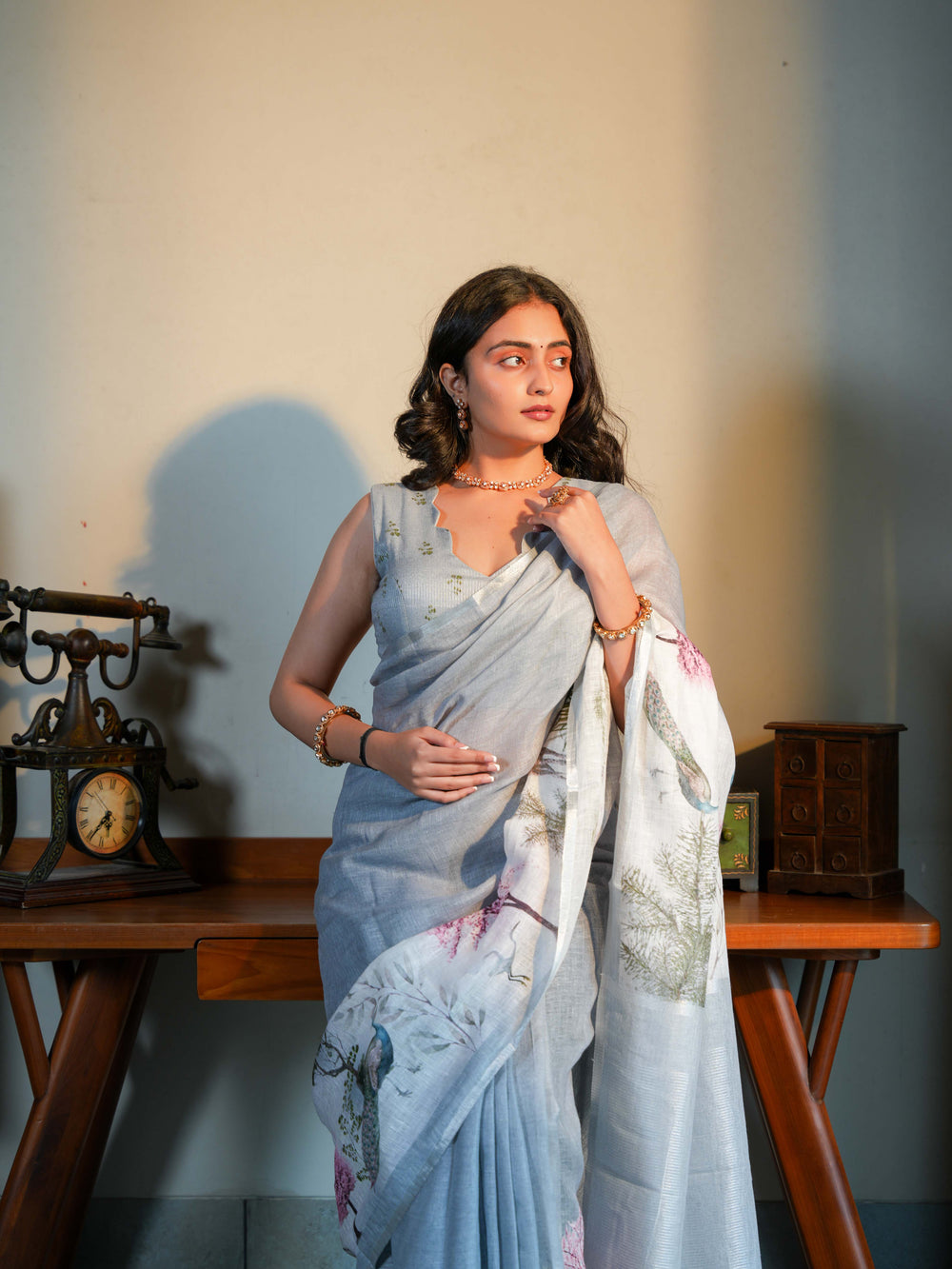 Redefine elegance with this serene grey linen-blend saree, adorned with a captivating peacock and floral digital print along the pallu. The soft, breathable fabric drapes gracefully, making it ideal for both daytime sophistication and evening charm.