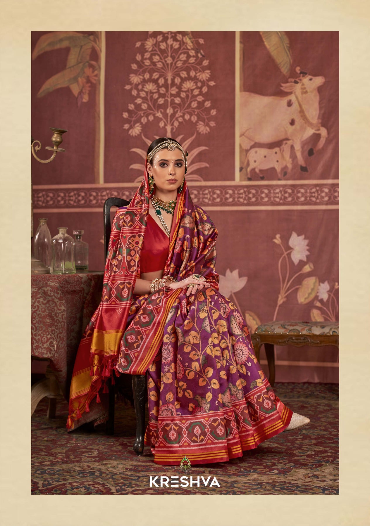Made from premium soft silk, the saree drapes luxuriously and offers a radiant sheen. The combination of floral designs with classic geometric Patola motifs reflects a blend of timeless tradition and refined elegance. The saree comes with a matching blouse piece, giving you versatile styling options.