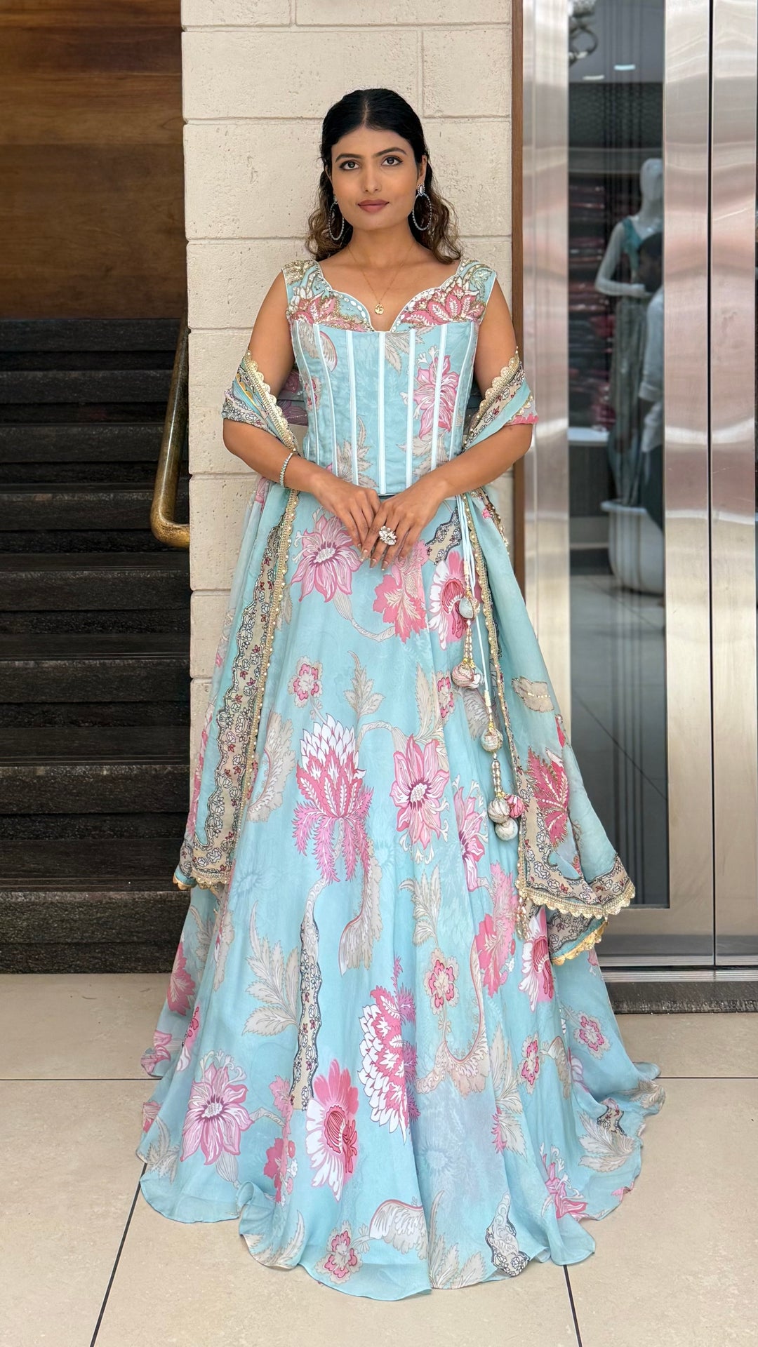 Powder Blue Floral Printed Designer Gown with Corset Bodice & Tassel Dupatta