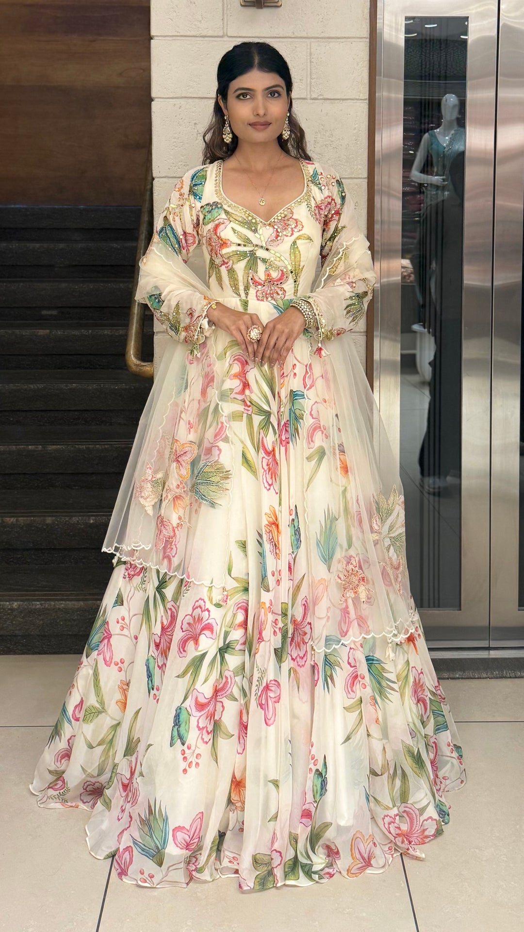 Multicolor Embroidered Designer Gown with Dupatta – Festive & Wedding Wear