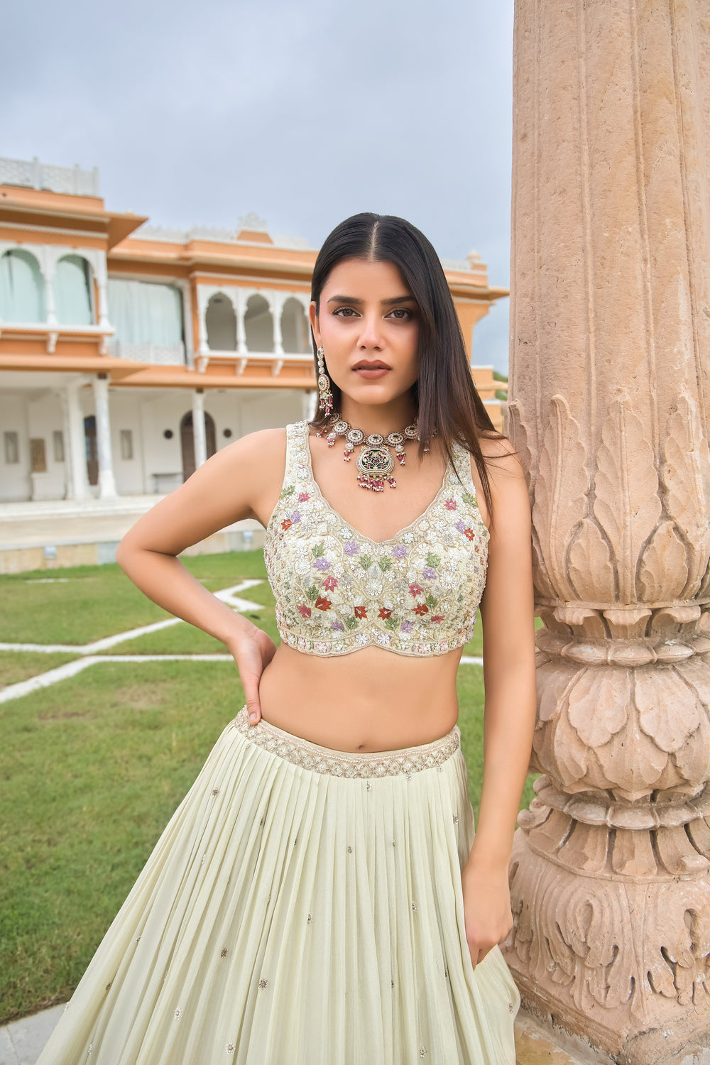 This light mint lehenga choli set, adorned with delicate multicolor floral embroidery and shimmering sequin accents across the flared skirt, radiates subtle elegance. The choli features a graceful neckline with detailed embellishments and a flattering fitted silhouette. A matching dupatta with ornate embroidered borders and refined detailing completes the pastel ensemble, perfect for festive and wedding occasions.