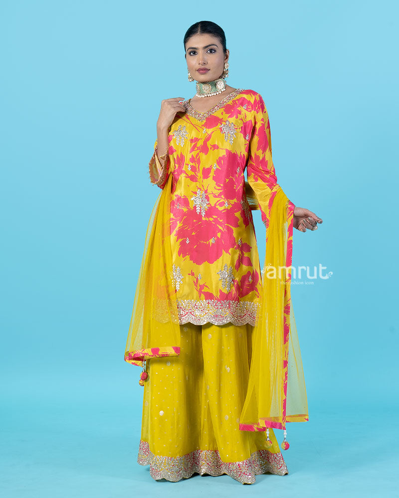 Sunshine Bloom Yellow Embroidered Palazzo Suit with Floral Print Pants & Sequin Crop To