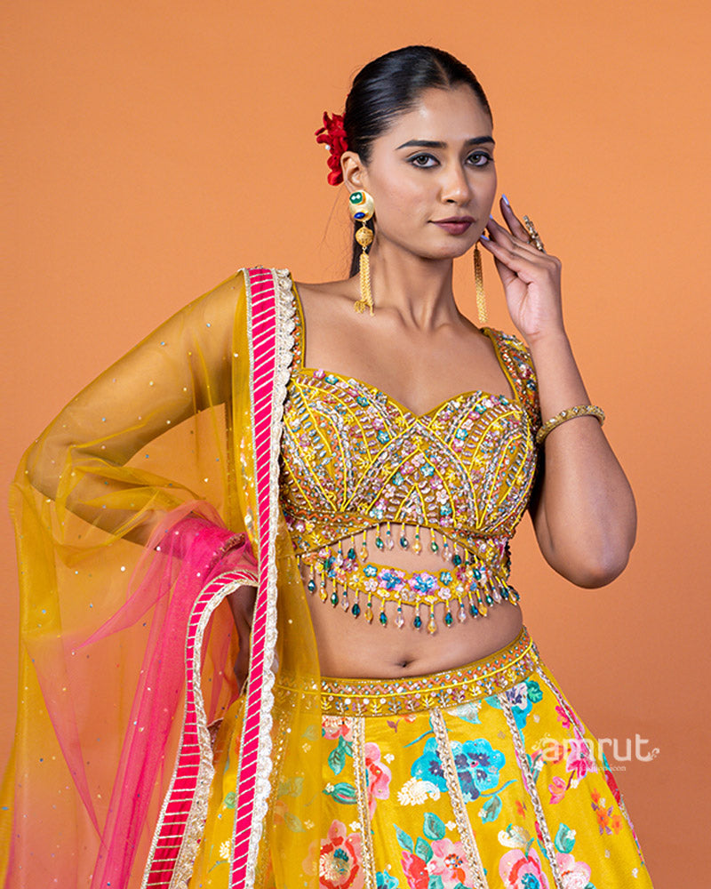 Mustard Yellow Floral Lehenga with Sequin-Embellished Choli and Sheer Dupatta