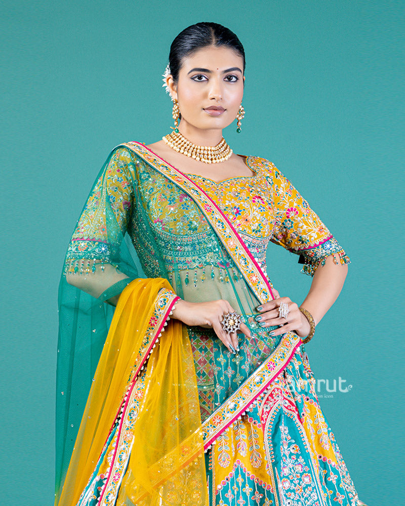 Teal Green and Mustard Yellow Embroidered Lehenga Choli with Yellow Dupatta