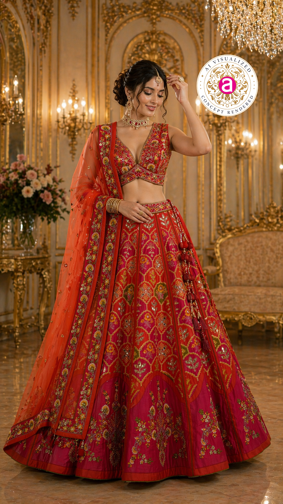 Step into vibrant royal elegance with this breathtaking red and rani pink designer lehenga set, crafted for women who love bold festive glamour with timeless heritage charm. Adorned with intricate floral embroidery, traditional motifs, mirror accents, and regal handcrafted detailing, this ensemble beautifully blends ethnic artistry with modern sophistication.