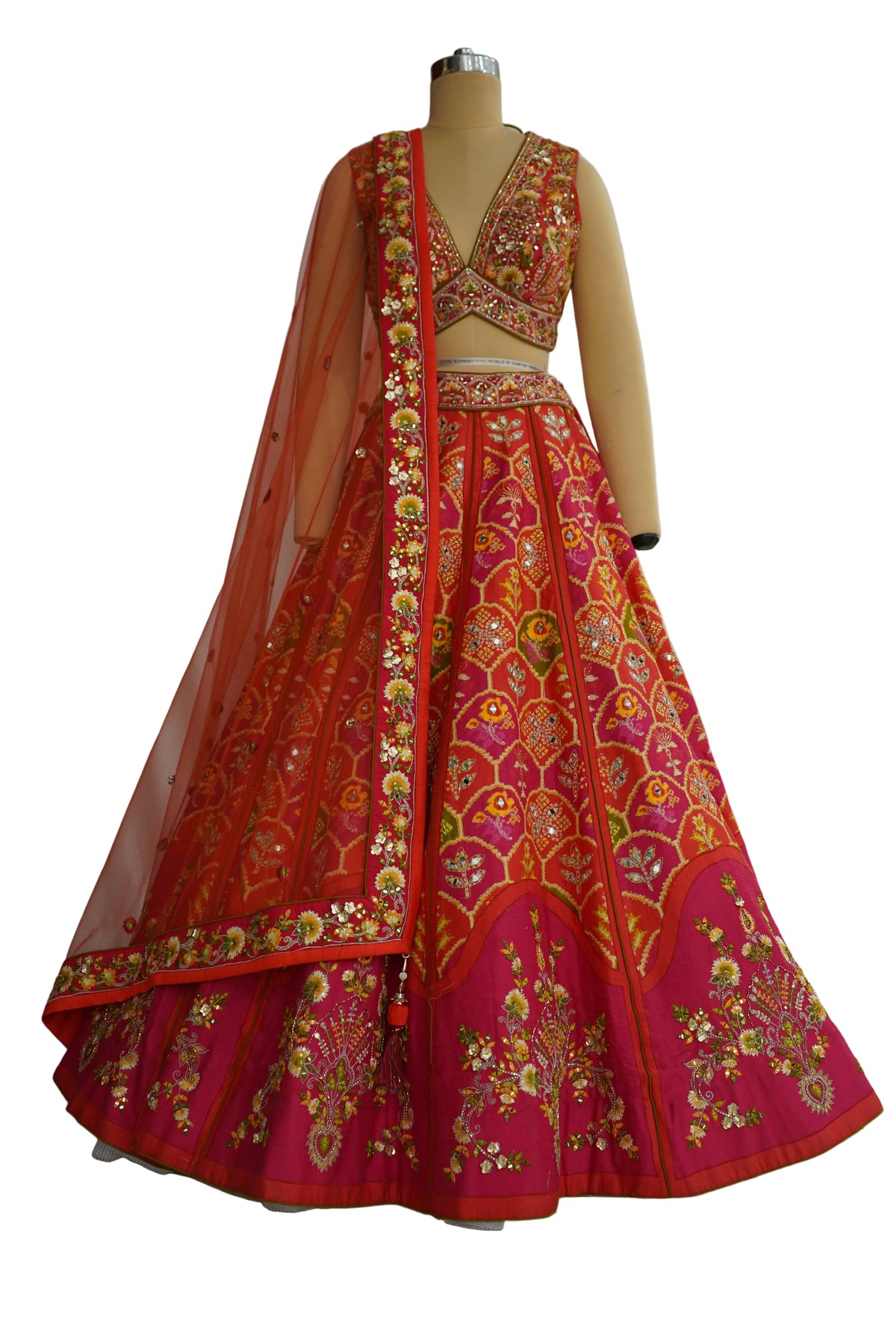 Red & Rani Pink Designer Lehenga Set with Embroidered Blouse and Net Dupatta