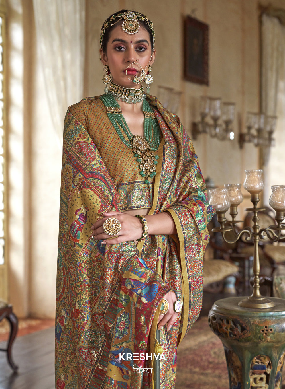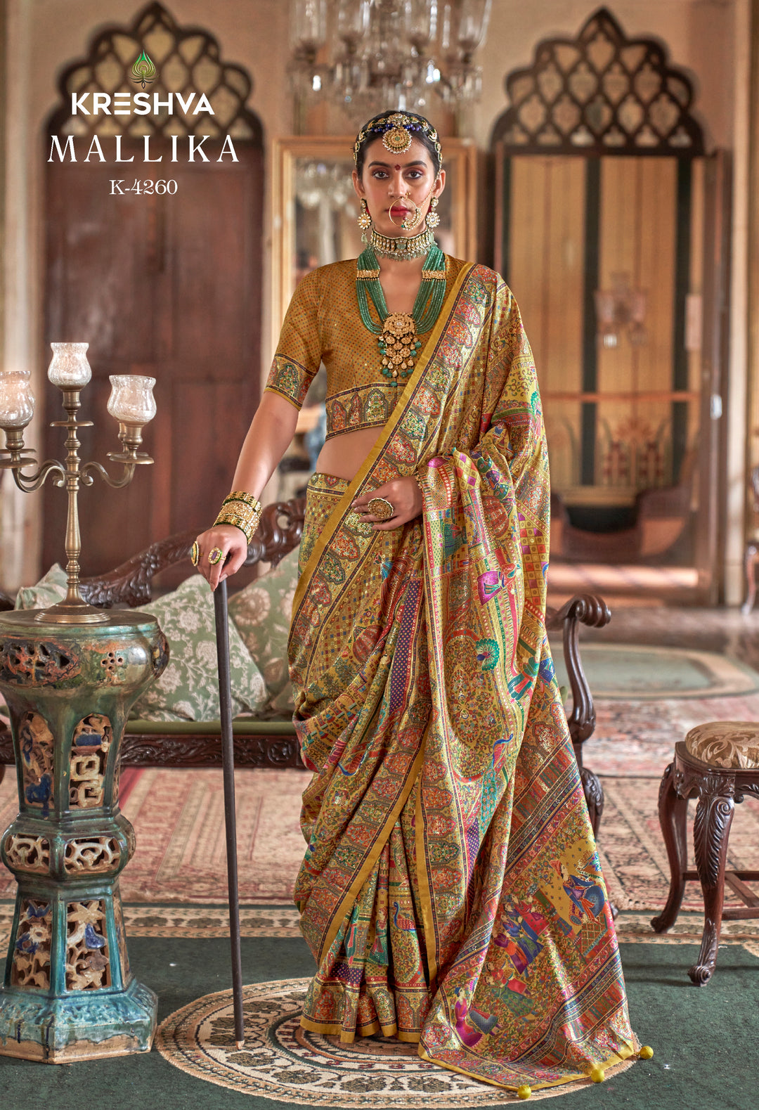Antique Gold Heritage Pashmina Inspired Designer Saree with Multicolour Royal Border