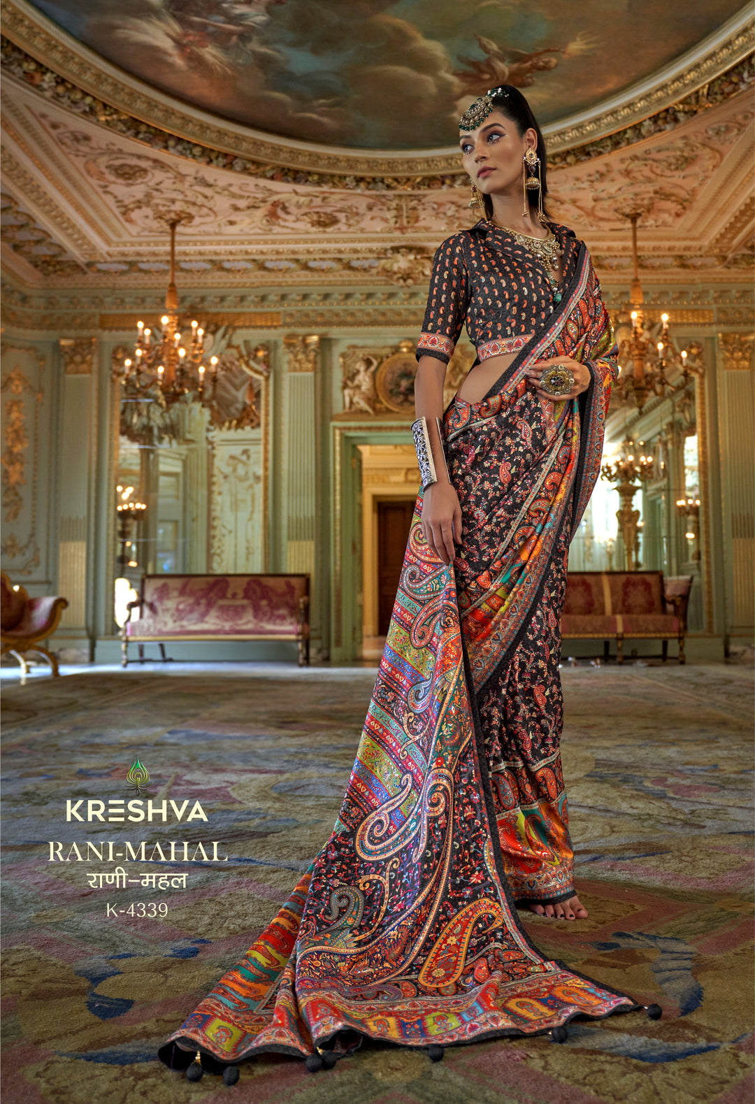 Black Multicolor Pashmina Inspired Heritage Print Designer Saree