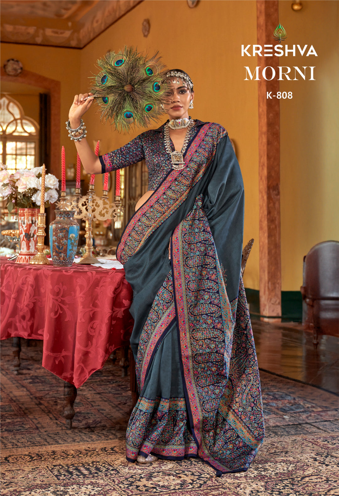 Deep Teal Heritage Pashmina Inspired Designer Saree with Royal Traditional Border