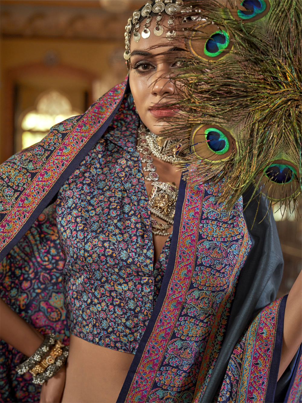 Royal Navy Blue & Heritage Multicolour Pashmina Inspired Designer Saree