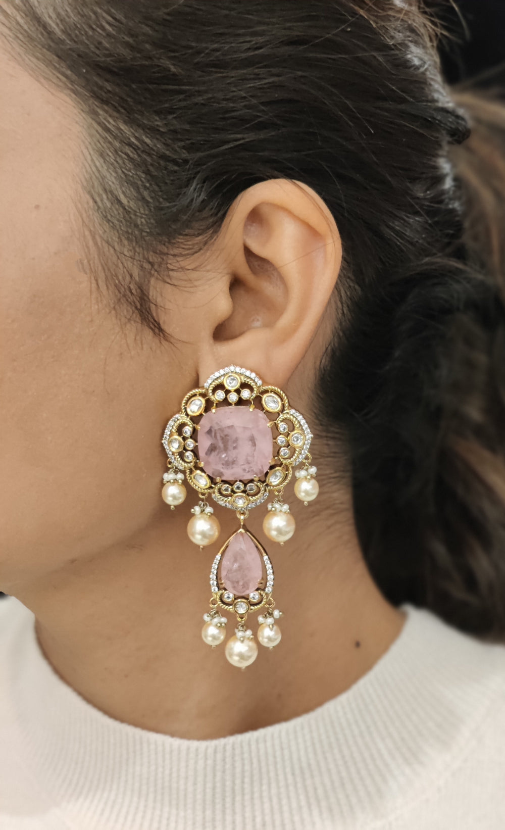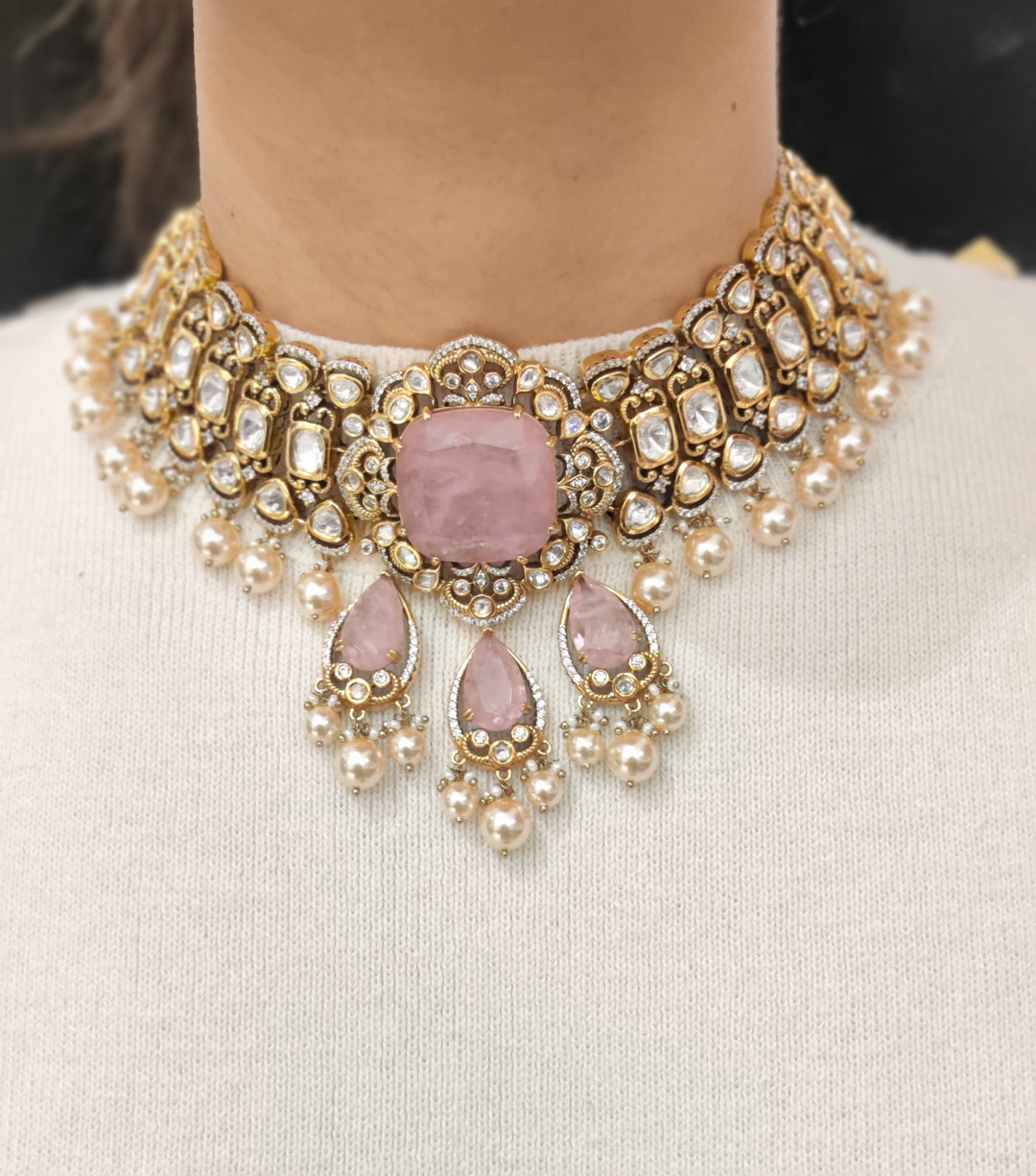 Blush Pink Stone & Gold Kundan Necklace Set with Statement Earrings
