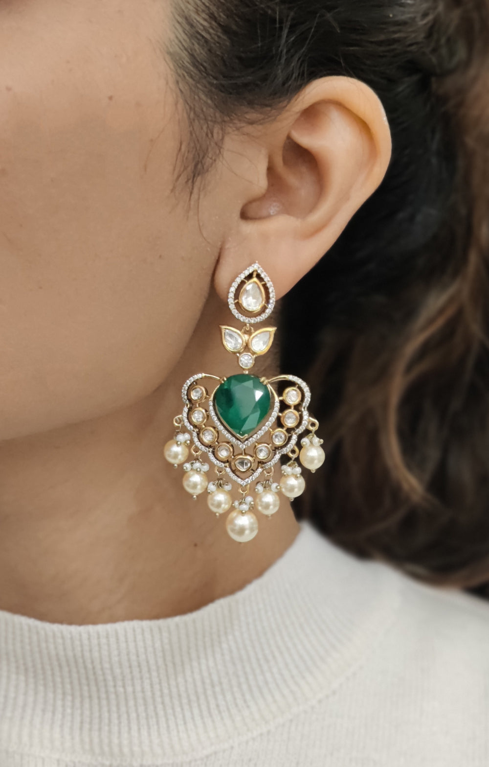 Emerald Green & Pearl Kundan Bridal Necklace Set with Heavy Statement Earrings