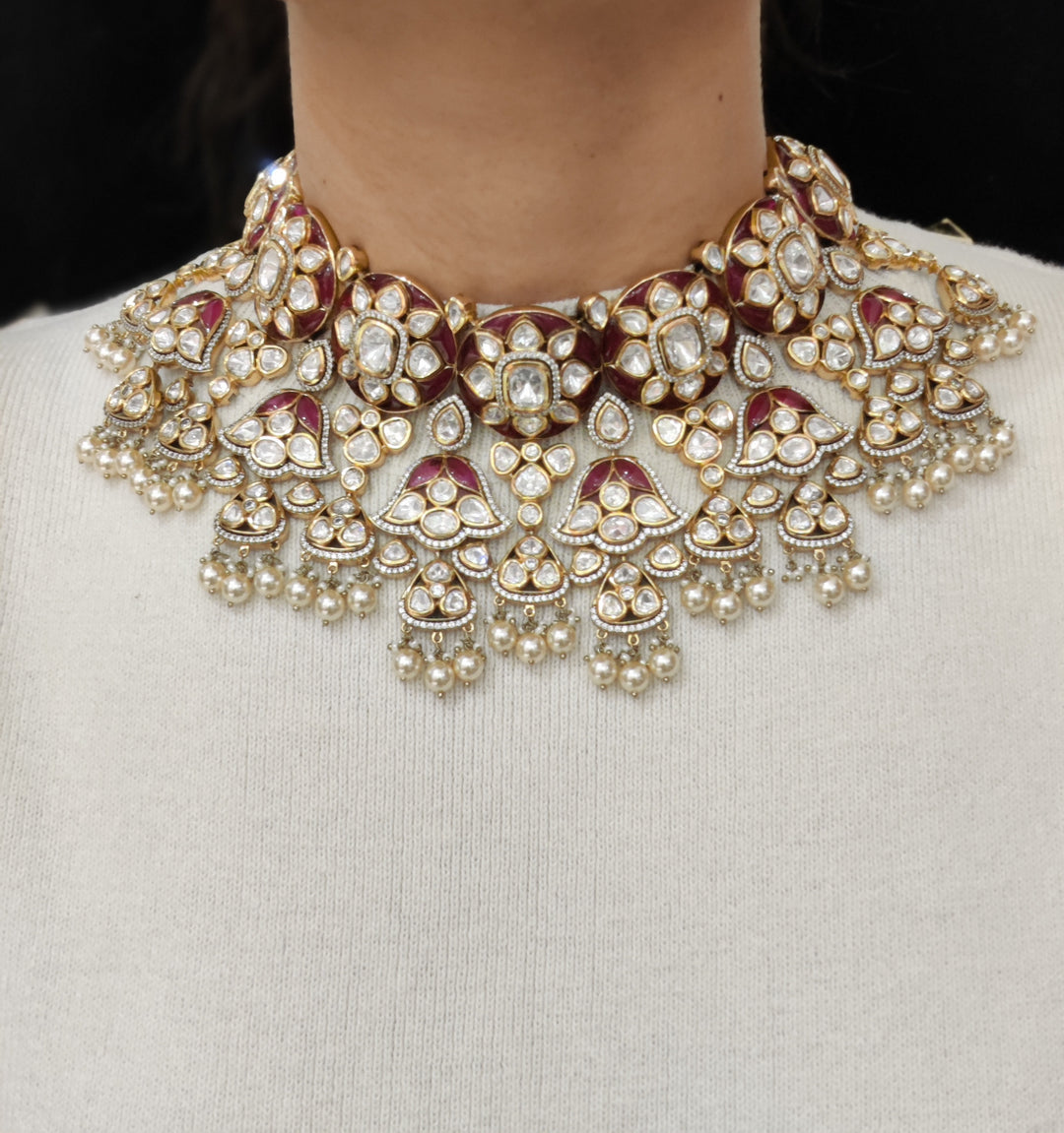 Ruby Red Kundan Bridal Choker Necklace Set with Pearl Drops & Matching Earrings