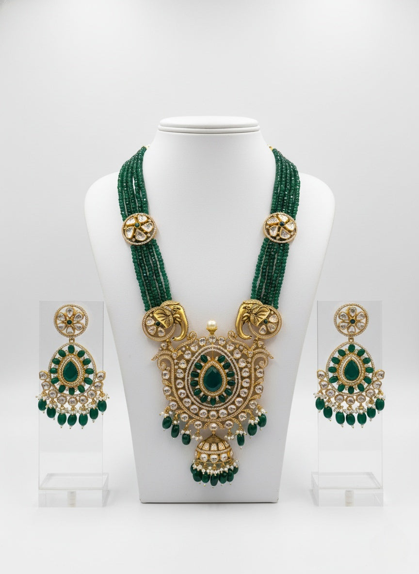 Material: Premium Alloy Base, Multi-Layer Emerald Beads, High-Quality Kundan Stones, Crystal Stones, Pearl & Bead Droplets
