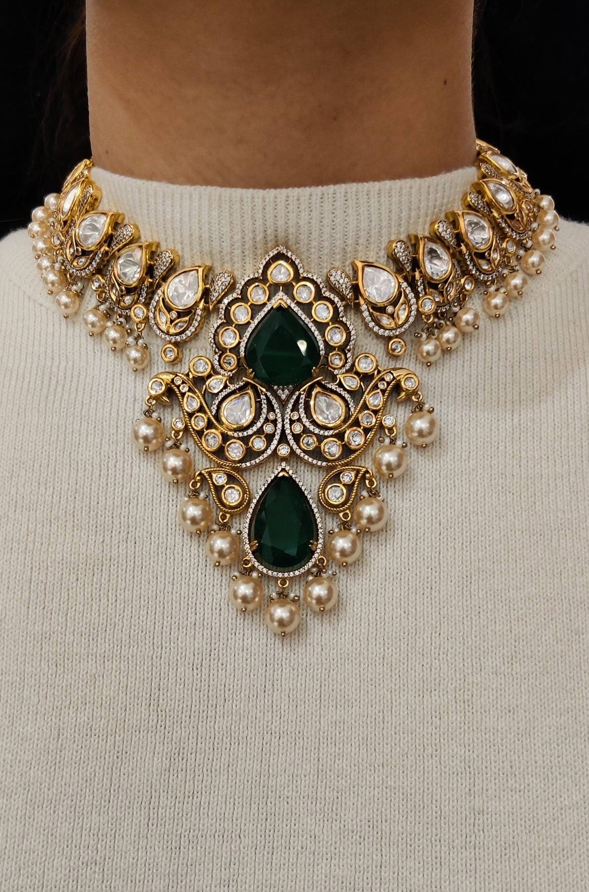 Necklace Design: Emerald green teardrop centerpiece with kundan work & pearl hangings