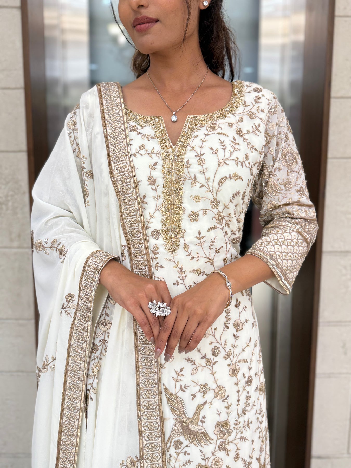 The Anarkali kurta features intricate gold-toned thread embroidery inspired by delicate floral vines and traditional motifs, thoughtfully spread across the bodice and flowing panels. The embroidery adds a subtle shimmer, enhancing the ivory base without overpowering its serene charm. The neckline is gracefully designed to complement the embroidery, while the three-quarter sleeves are finished with finely detailed borders that elevate the overall look.