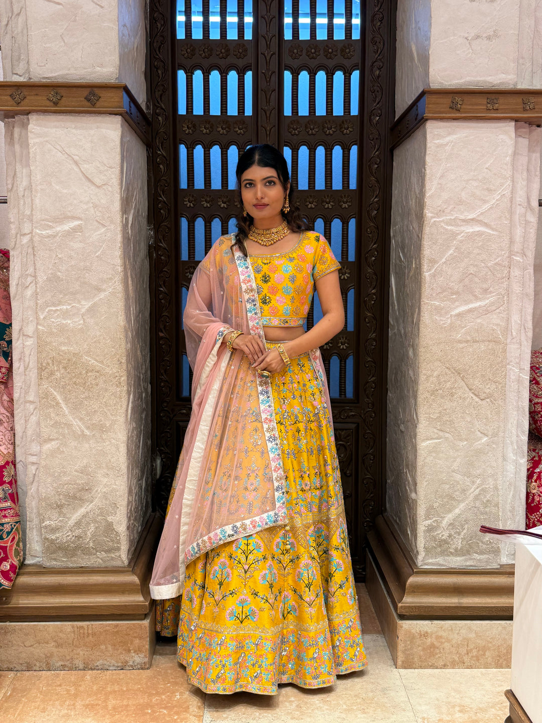Mustard Yellow Floral Embroidered Lehenga Set with Soft Pink Net Dupatta