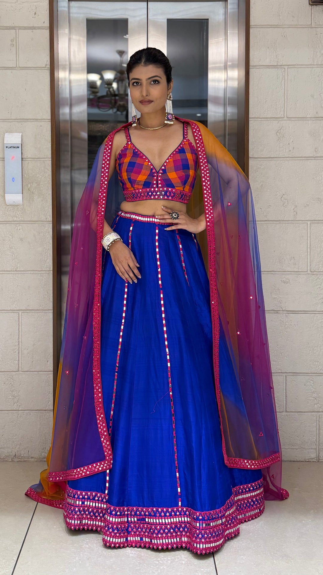 Royal Blue Mirror-Work Lehenga Set with Multicolor Checked Blouse & Ombre Net Dupatta